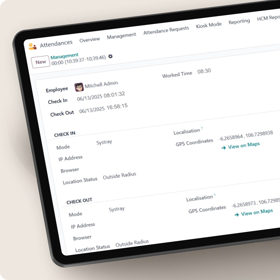Catat semua check in/out dengan timestamp dan koordinat GPS, termasuk manual input atau koreksi HR, serta riwayat perubahan yang bisa diekspor untuk compliance