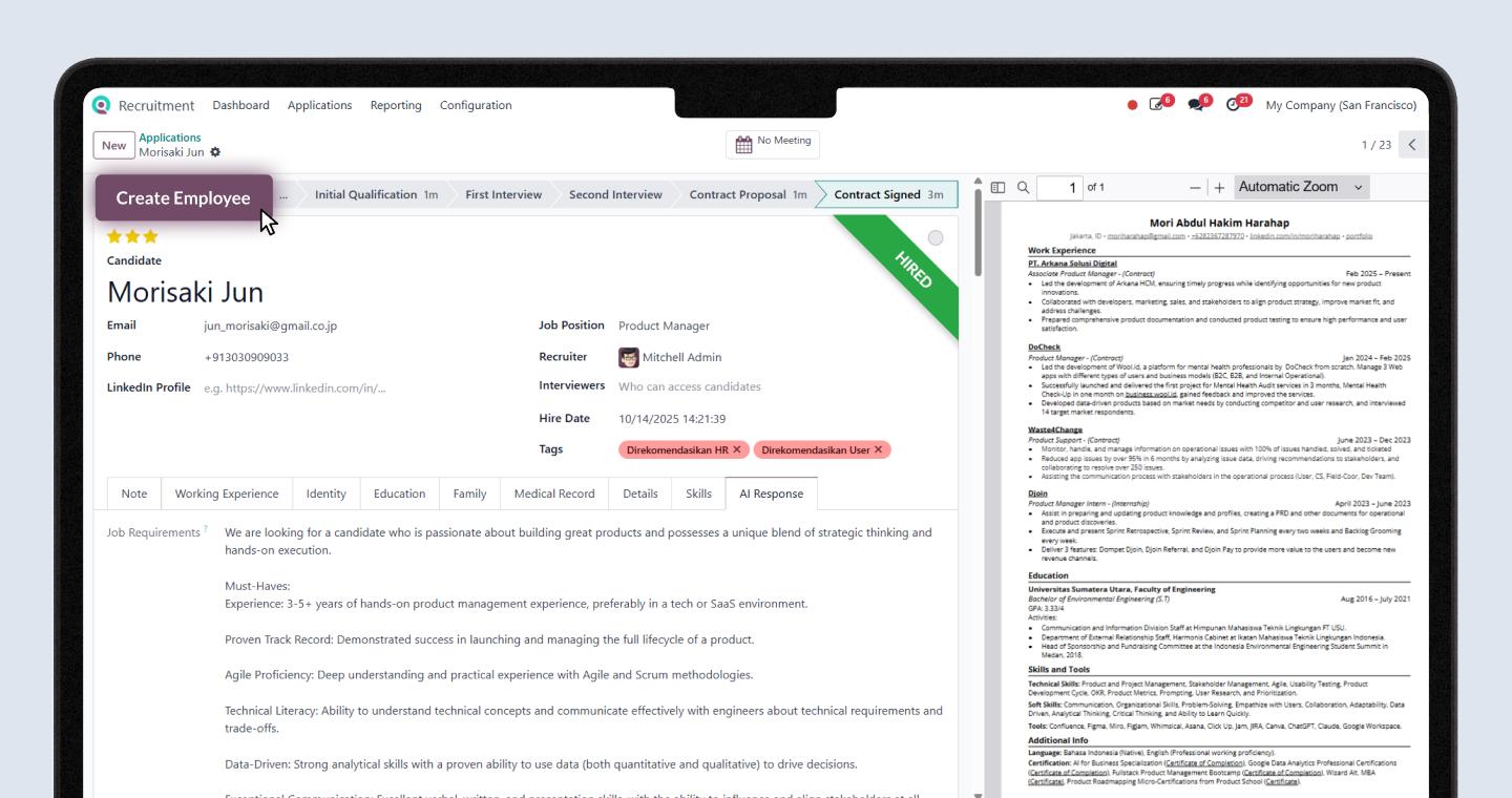 “Yang paling terasa adalah dalam manajemen siklus hidup karyawan. Dulu, proses update data karyawan harus dilakukan manual satu per satu yang memakan waktu berhari-hari. Sekarang, perubahan data massal bisa dilakukan dalam hitungan menit. Selain itu, pembuatan surat mutasi dan kontrak karyawan yang dulunya memakan waktu 30-60 menit per dokumen karena harus input data manual ke template Word, kini otomatis ter-generate dari sistem hanya dalam sekali klik. Ini menghemat waktu tim HR hingga lebih dari 80%.”