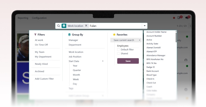 Cari data berdasarkan nama, NIK, atau departemen; kombinasikan filter untuk hasil spesifik; simpan filter untuk pencarian berulang; dan akses cepat data yang sering dipakai, semua dalam hitungan detik
